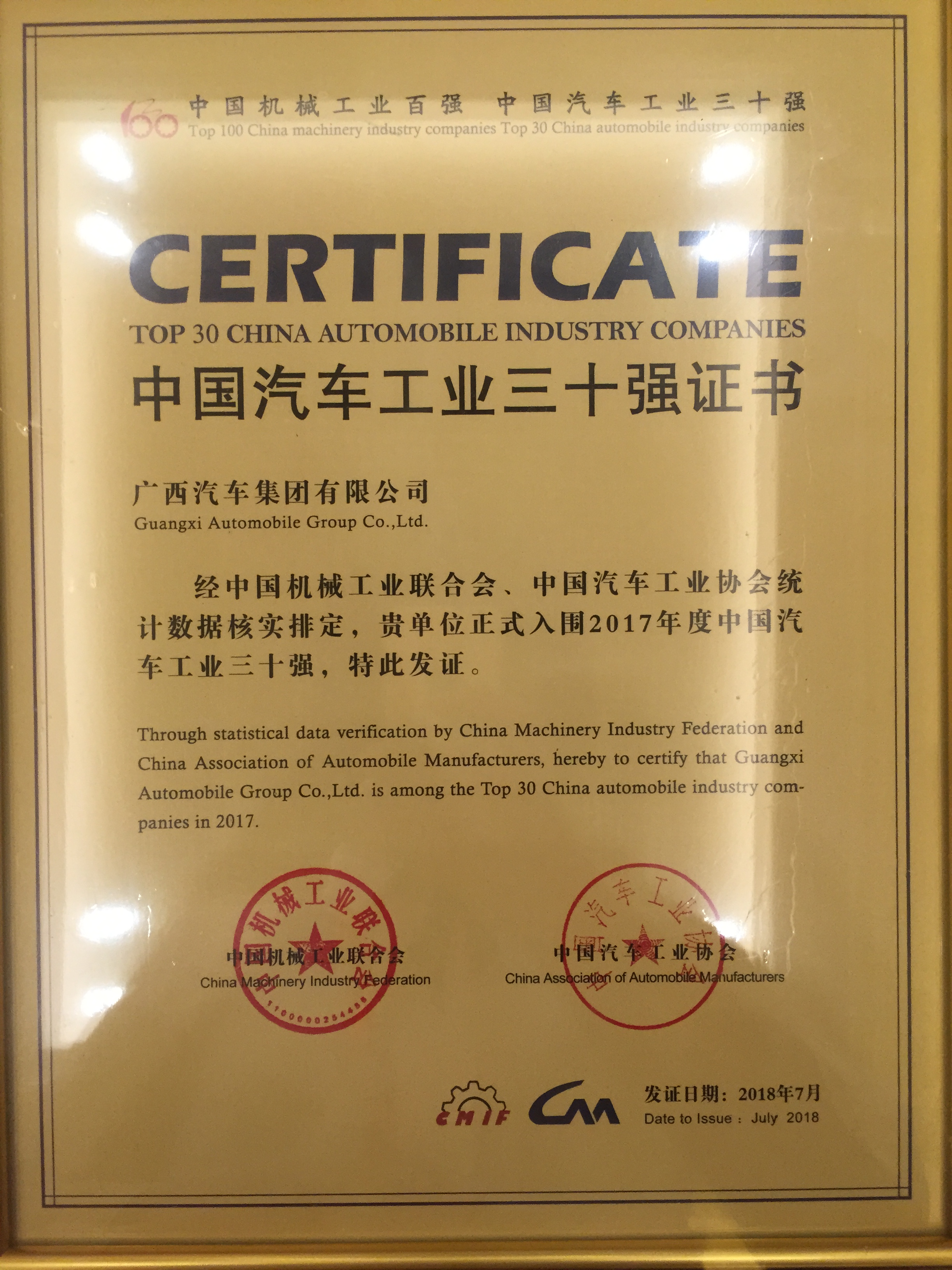 2018713日,由中國機械工業(yè)聯(lián)合會、中國汽車工業(yè)協(xié)會聯(lián)合組織開展的“2017年中國機械工業(yè)百強企業(yè)、汽車工業(yè)30強企業(yè)”榜單揭曉并正式向社會發(fā)布,廣西汽車集團公司以2017年度營業(yè)收入220億元榮登“2017中國汽車工業(yè)30強企業(yè)”榜單,排名第21位,集團已連續(xù)10年躋身“中國汽車工業(yè)30強企業(yè)”行列。